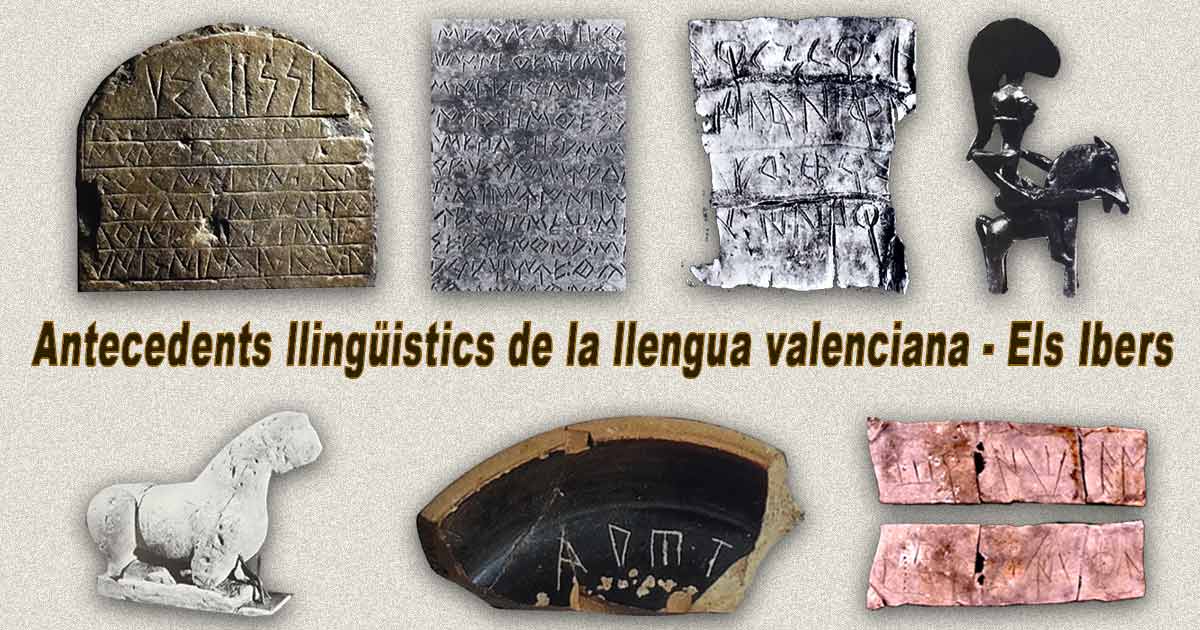 Dins dels llimits del Regne de Valencia, com a primer antecedent llingüistic en numerosos vestigis arqueologics, en inscripcions escrites i en alfabet genul tenim al poble iber, testimonis del qual inunden les poblacions de Moixent, Bocairent, Lliria, Alcoy, Villena, Elig, Murla, Chest, Sinarques, Alcala de Chisvert, Borriol, Castellnou, Sagunt, i dotzenes mes.