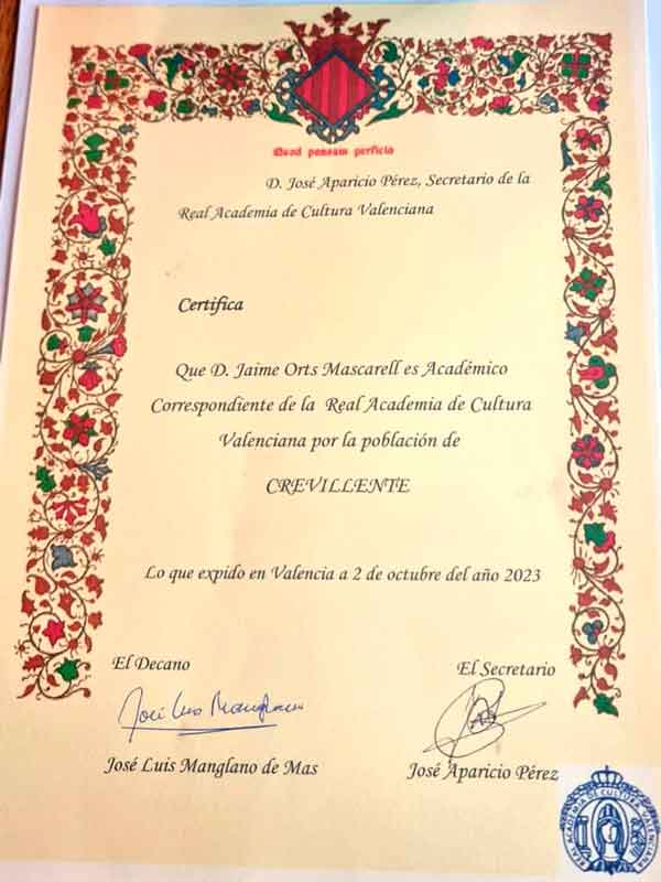 Presidente de la Asociación Cultural de las Comarcas del Antiguo Reino de Valencia y Académico de la Real Academia de Cultura Valenciana correspondiente por Crevillent.